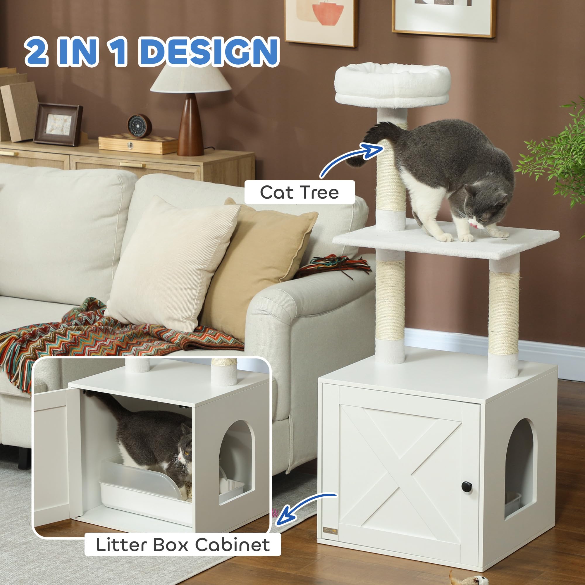 PawHut Cat Tree with Litter Box Enclosure, 2-in-1 Cat Tower with Bed, Climbing Platforms, Scratching Posts, Modern Pet Furniture for Indoor Kittens, White