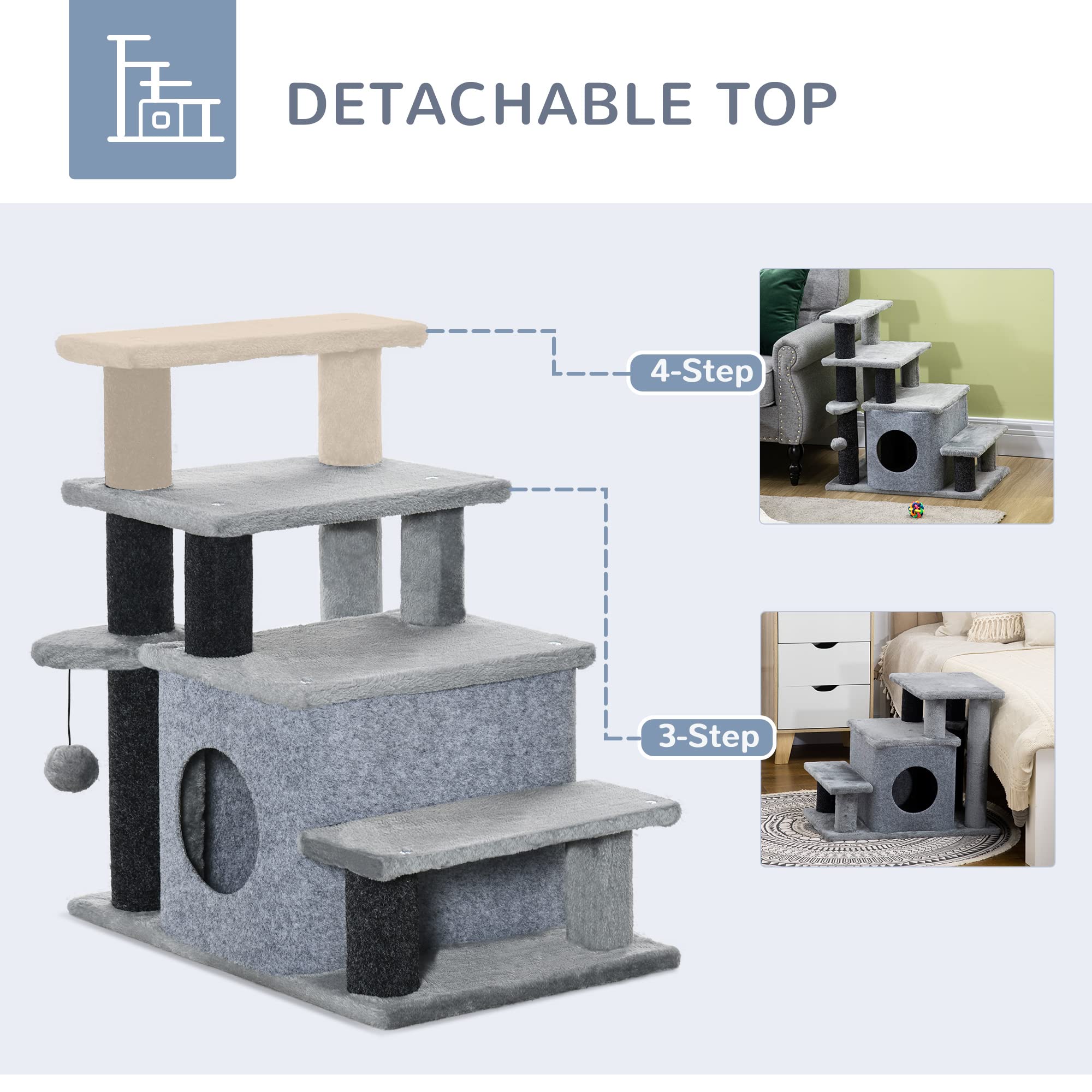 PawHut Pet Stairs, Adjustable Height 3 Step/4 Step Cat Steps with Cat Scratching Post, Condo, Toy Ball for High Bed, Sofa, Couch, for Indoor Small Kittens, Gray